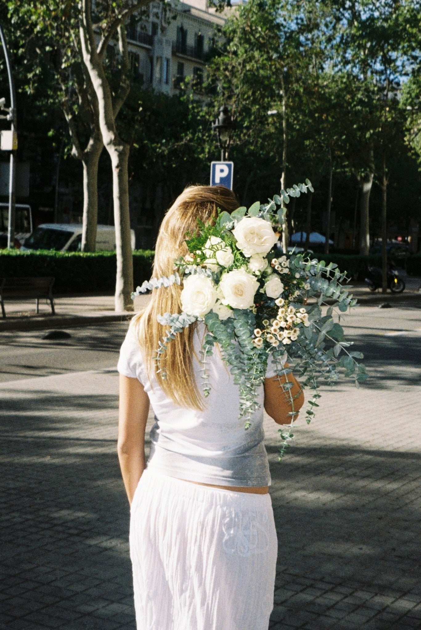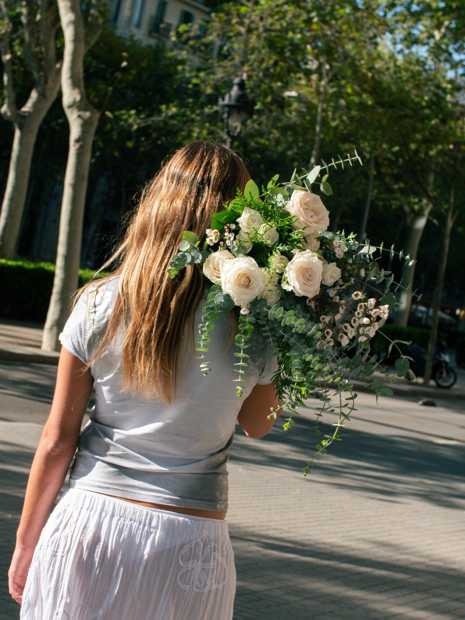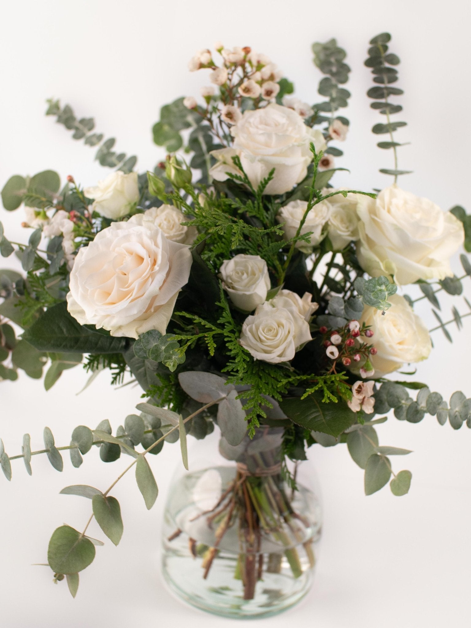 Ram de roses blanques de diferents mides, eucaliptus i flor de cera. Un ram de roses amb un toc modern i original, ideal per regalar.