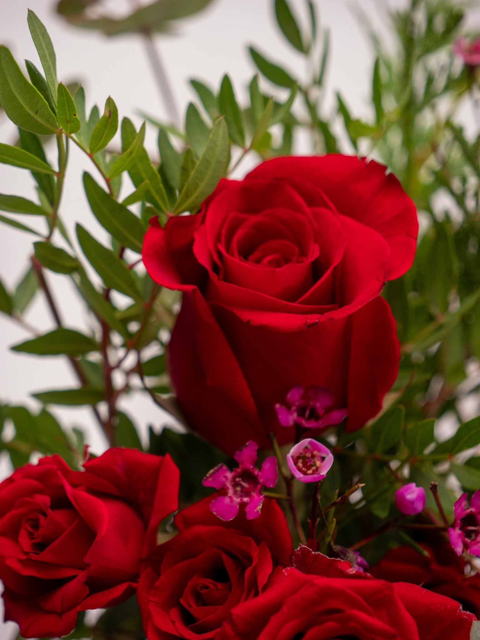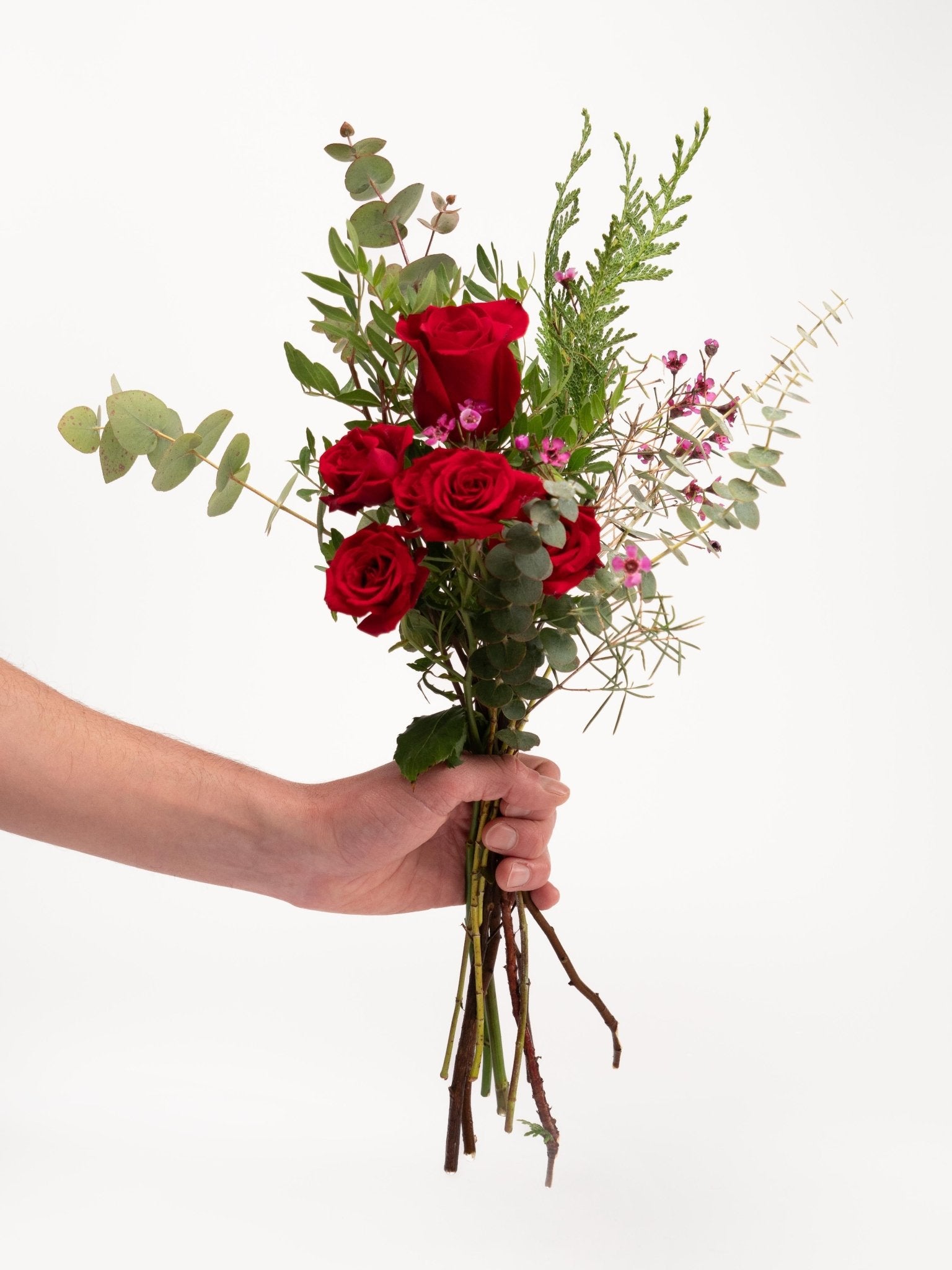 Ram petit de roses vermelles de diferents mides, eucaliptus i flor de cera. Un ram de roses amb un toc modern i original. És ideal per regalar.