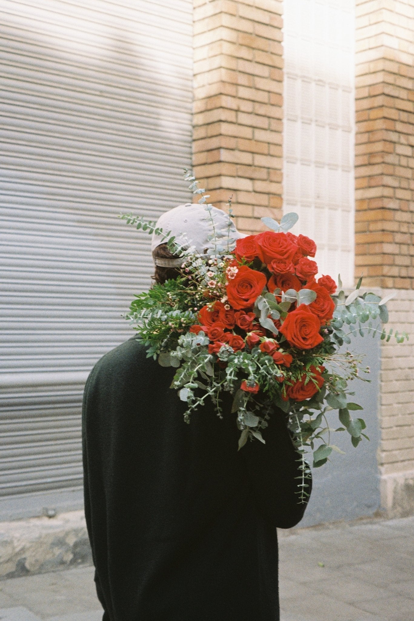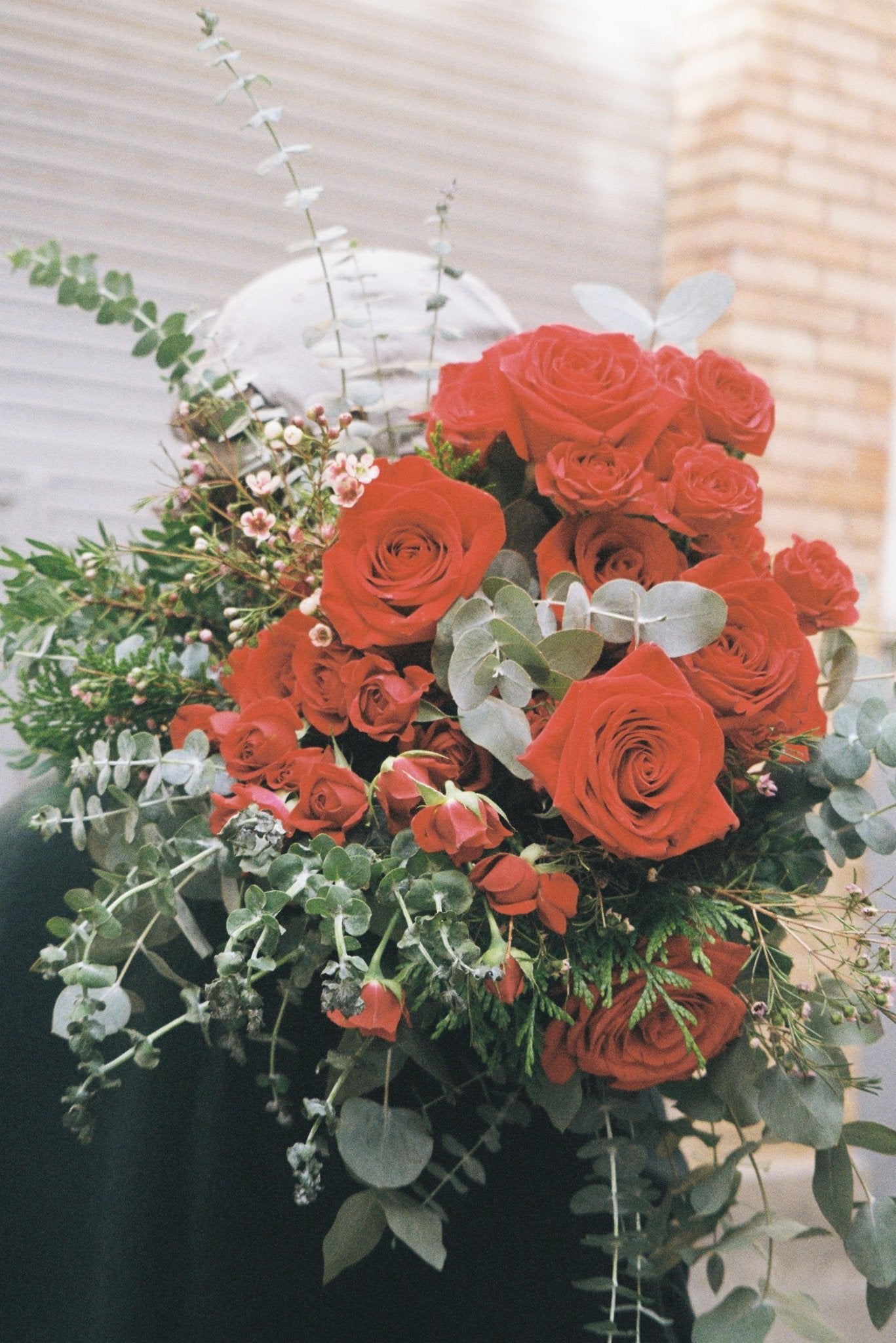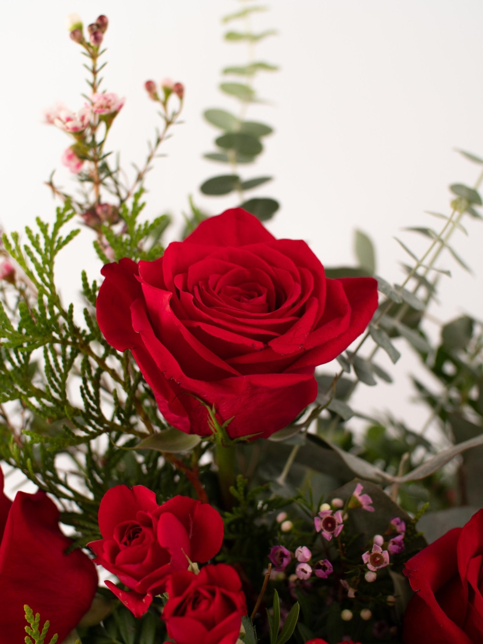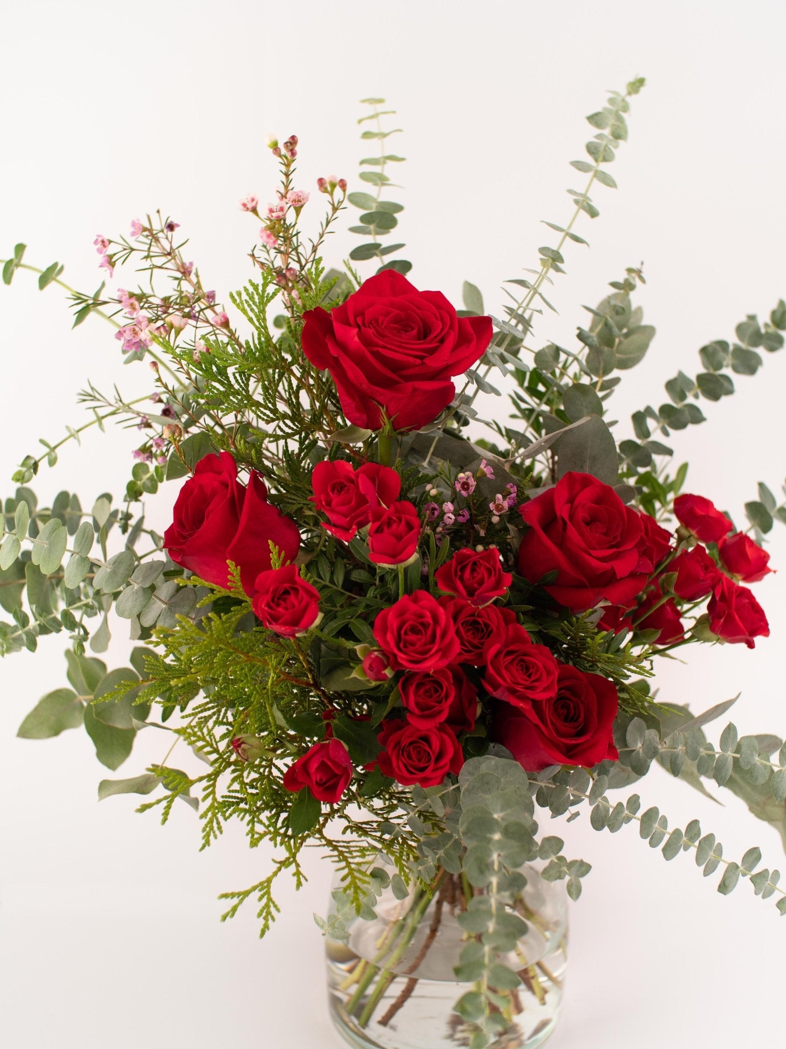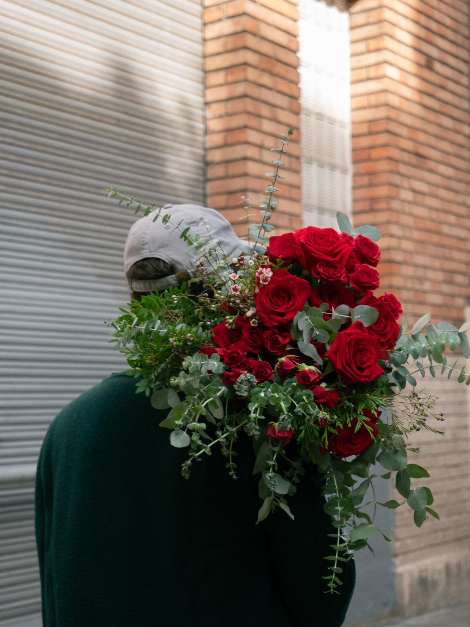 Ram de roses vermelles de diferents mides, eucaliptus i flor de cera. Un ram de roses amb un toc modern i original. És ideal per regalar.